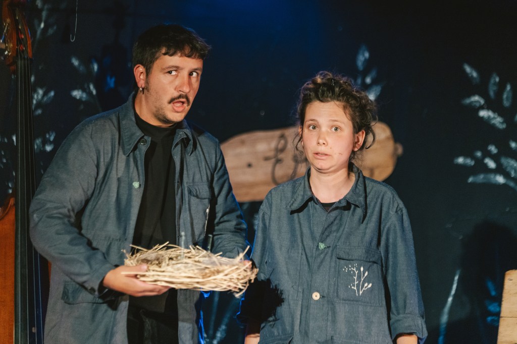 Pour donner vie à ce conte, nous imaginons une narration en duo : la rencontre de nos pratiques respectives – ombres, théâtre d’objet, marionnette, musique et chanson – constituer l’imaginaire visuel et sonore du spectacle. L’univers d’Éri se déploie autour de la contrebasse, élément central de la scénographie évoquant le grand chêne du bosquet. Tantôt surface de jeu et de narration, arbre creux, nid de Pivert ou terrier rempli de noix, ce gros instrument sera considéré à des fins poétiques comme un objet à part entière. Les ombres se dessinent dans trois castelets en céramique. Afin de servir et d’appuyer le récit, nous utiliserons des objets modestes, des céramiques en terre brute, des petits rien trouvés dans nos jardins tantôt figures marionnettiques, tantôt créateurs de sons ou de mélodies, ils constitueront la boîte à outils nécessaire à la fabrication de trouvailles mécaniques et d’astuces magiques grâce auxquelles naîtra l’univers merveilleux du monde d’Éri.